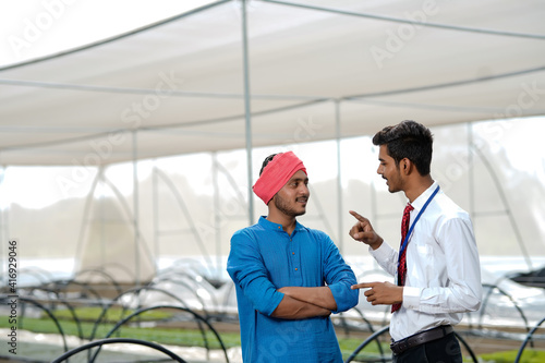 © PRASANNAPIX, Obraz premium Young indian agronomist discuss with farmer at greenhouse