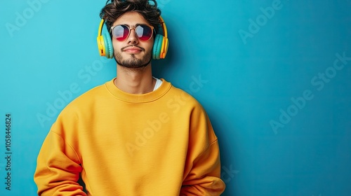 © Lala, Fototapeta premium Young Indian man in a baggy sweatshirt and large plastic headphones embodies the vibrant 80s and 90s disco vibe. Captivating hipster style captured with ample copy space.