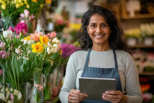 © Shivani, Fototapeta premium young indian woman using laptop at flower shop