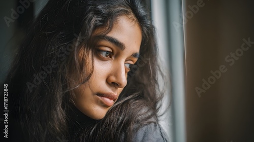 Fototapeta premium Young Indian Woman with Teary Eyes Sitting by Window – Emotional and...