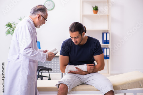 Obraz premium Young injured man visiting experienced male doctor traumatologis