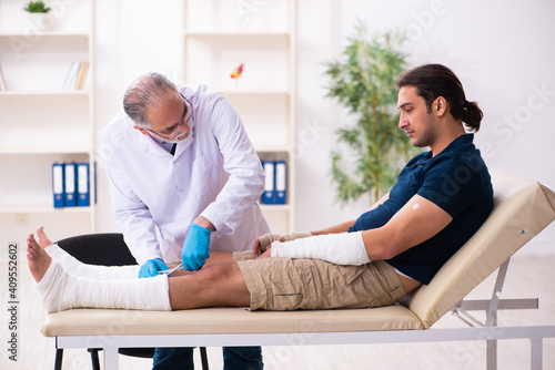 Fototapeta premium Young injured man visiting old doctor traumatologist