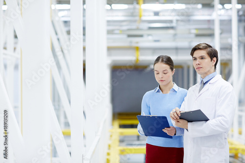 Obraz premium Young IT-service engineers describing characteristics of new technical...