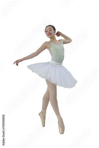 © Alex, Naklejka premium young Japanese ballerina poses in a photo studio with ballet elements showing stretching and plasticity, isolated on transparent background, png