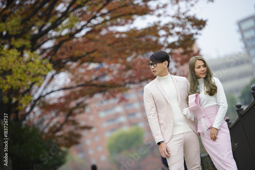 © brostock, Fototapeta premium Young japanese couple in love stand together under autumn trees