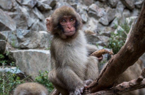Fototapeta premium Young Japanese Macaque sitting on a wooden surface in a zoo