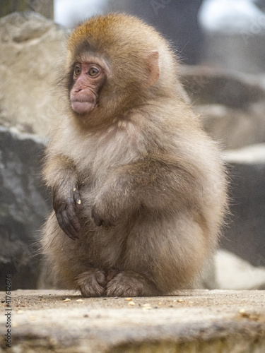 © Hanstography, Naklejka premium young Japanese macaque snow monkey by hot spring 1