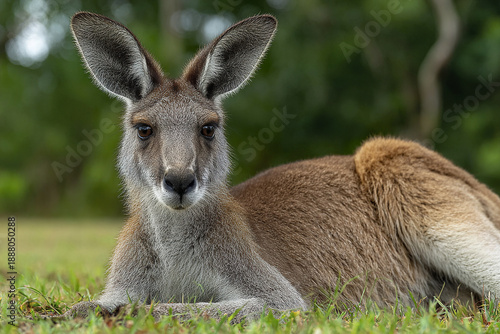 © Thanthara, Fototapeta premium Young kangaroo lying on green grass with relaxed expression in natural wildlife environment during daytime