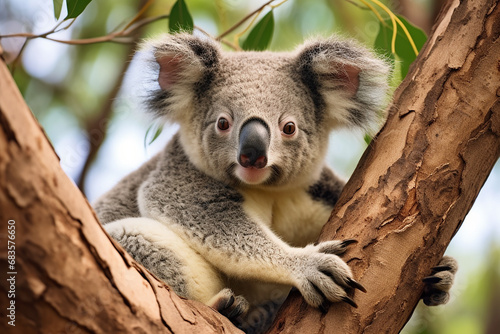 Fototapeta premium Young Koala (Phascolarctos cinereus) Laying on Branch - Created with Generative AI Tools