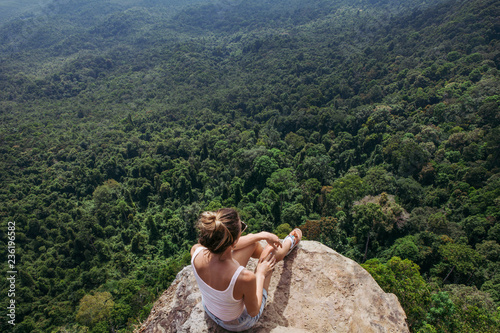 Naklejka premium Young lady hiker sitting on top of a mountain
