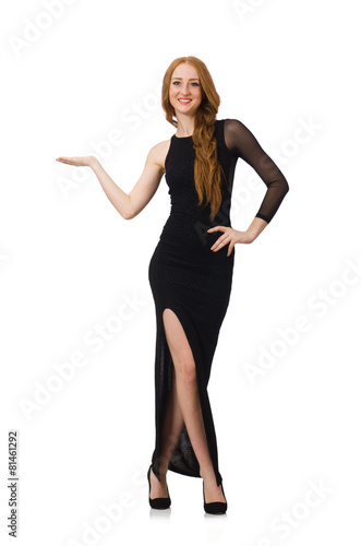 Fototapeta premium Young lady in elegant black dress isolated on white