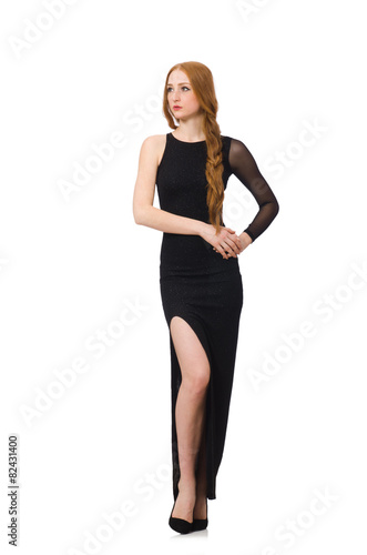 Fototapeta premium Young lady in elegant black dress isolated on white