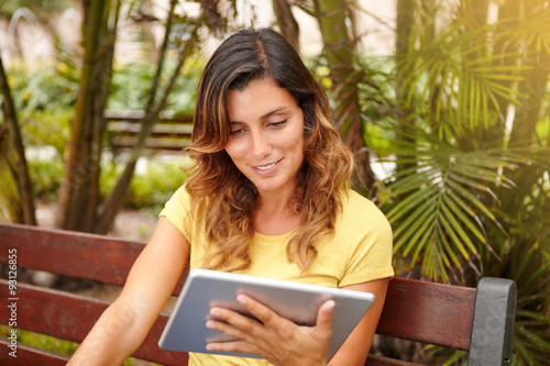 © pablocalvog, Fototapeta premium Young lady toothy smiling while using tablet