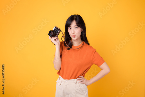 © Jirawatfoto, Obraz premium Young lady with a camera, capturing the essence of a joyful travel experience.