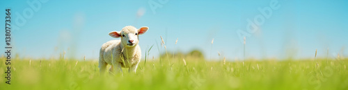 © ANASTASIIA, Obraz premium Young lamb grazing in a lush green field against a clear sky