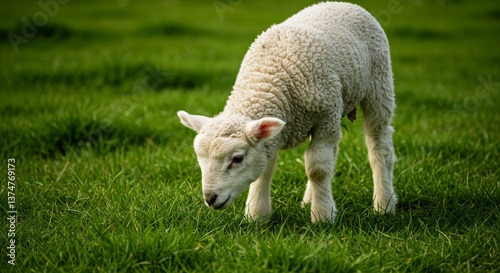 © ArtyKris99, Fototapeta premium Young lamb grazing in lush green field