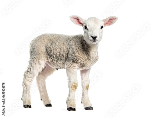 © kingg, Fototapeta premium Young lamb, standing, light grey wool, white face, isolated