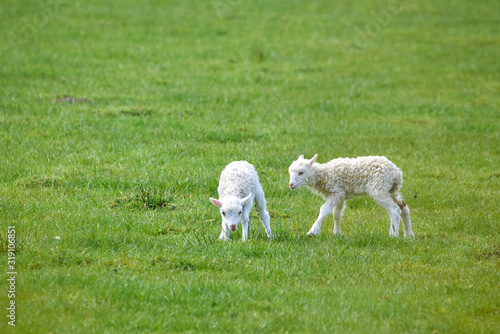 © Adrian , Obraz premium Young Lambs playing on green grass (Ovis aries)