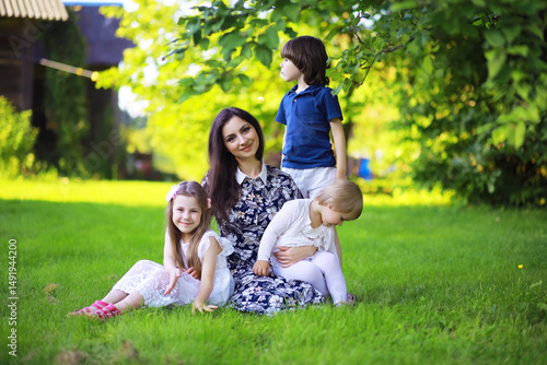 Fototapeta premium Young large family on a summer morning walk. Beautiful mother with children...