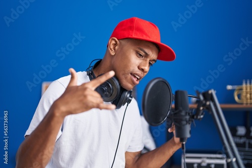 Obraz premium Young latin man artist singing song reading notebook at music studio