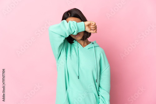 Obraz premium Young latin woman isolated on pink background covering eyes by hands