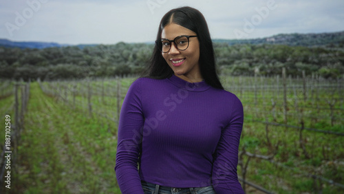 © Krakenimages.com, Fototapeta premium Young latin woman removes black frame glasses with both hands in forest clearing under overcast sky; calm reflection.