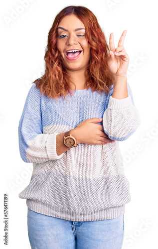 Obraz premium Young latin woman wearing casual clothes smiling with happy face winking at the camera doing victory sign with fingers. number two.