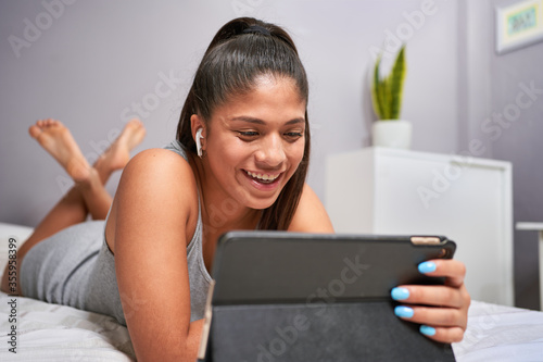 © Jonathan, Naklejka premium Young Latina studying and performing class assignments online with his computer from home for causes of coronavirus. Sitting at her table with leaves and pens. Videoconferencia con sus profesores.