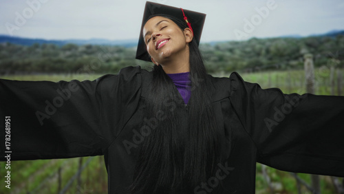 © Krakenimages.com, Naklejka premium Young latina woman in black graduation gown and mortarboard with red tassel spreads arms in green countryside field; academic achievement pride.