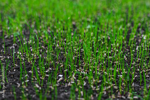 Naklejka premium Young lawn grass has sprouted. Selective focus.