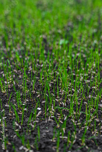 Obraz premium Young lawn grass has sprouted. Selective focus.