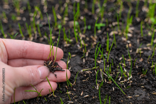 Obraz premium Young lawn grass has sprouted. Selective focus.