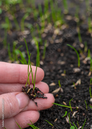 © yanadjan, Naklejka premium Young lawn grass has sprouted. Selective focus.