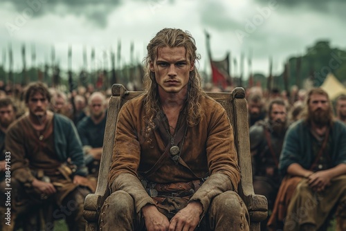 © ChaoticMind, Fototapeta premium Young leader sitting on a throne during a gathering of warriors in a medieval setting with cloudy skies