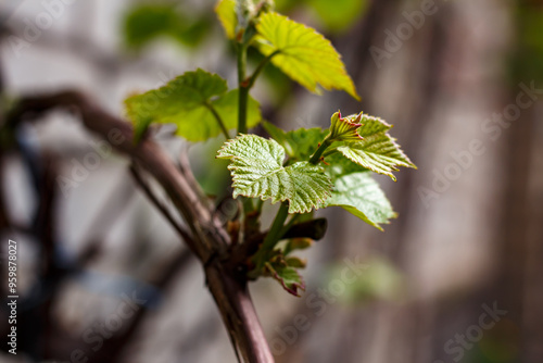 © glebantiy, Obraz premium Young leaves on a grape branch