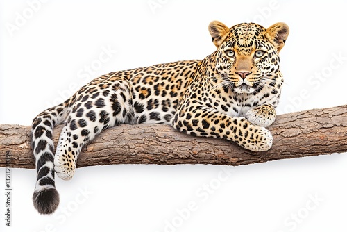 © KTI, Fototapeta premium Young Leopard Resting on Tree Branch Against White Background
