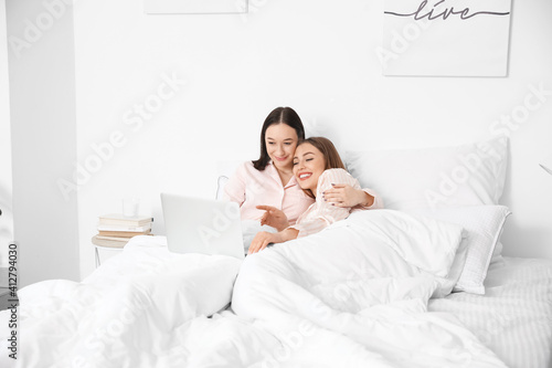 Fototapeta premium Young lesbian couple with laptop in bed at home