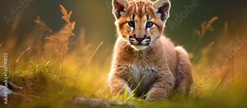 Obraz premium Young lion cub walking in grassy field