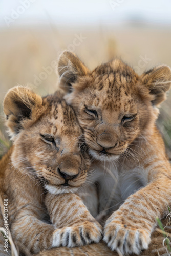 © Natalia, Fototapeta premium Young lion cubs playing with each other in the savannah,