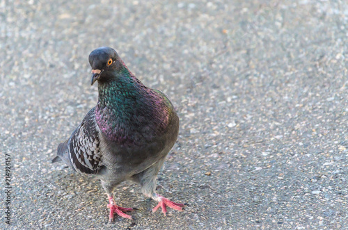 Obraz premium Young lonely pigeon walking along the asphalt
