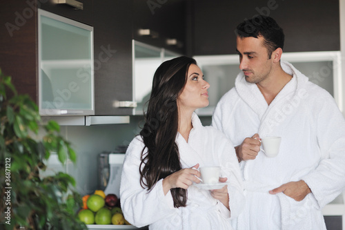 © .shock, Fototapeta premium Young love couple taking fresh morning cup of coffee