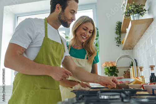 Obraz premium Young loving couple making homemade pizza while standing at the kitchen together