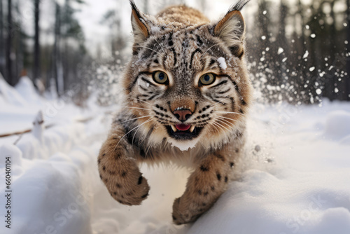 Obraz premium Young lynx, a predator hunts, runs through the snow