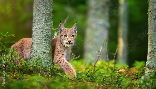 Fototapeta premium Young Lynx Frolics in a Vibrant Green Forest, Basking in the Soft Light of...