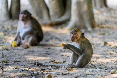 Obraz premium Young macquaqe monkey eating a mango left behind by tourists, Siem Reap,...