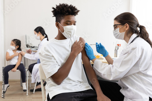 © offsuperphoto, Obraz premium young male african wearing medical face mask and getting vaccinated from doctor, to build up or maintain immunity