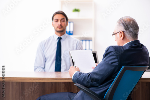 © Elnur, Obraz premium Young male candidate employee meeting with old recruiter