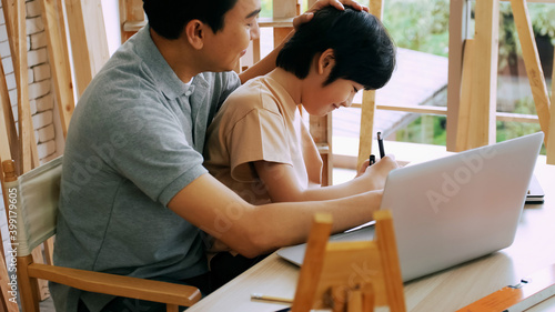 © ronnarong, Obraz premium Young male carpenter teaching his son how to work with wood in workshop.