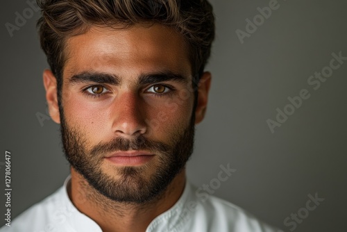 © c80, Fototapeta premium Young male chef poses confidently with focused expression in modern kitchen setting