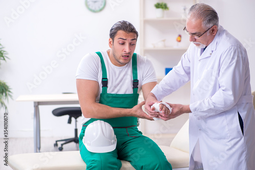 Fototapeta premium Young male contractor visiting old doctor